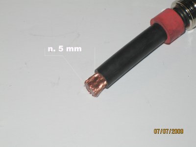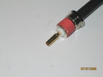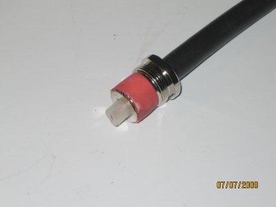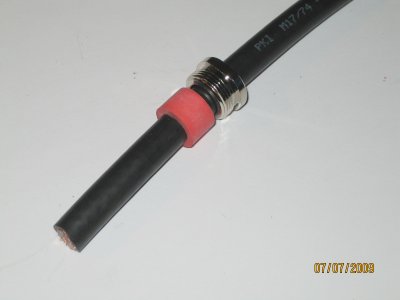 kuparivaippa 90 asteen kulmaan kaapeliin nähden. Työnnä kontaktiprikka keskieristeen ja punotun vaipan väliin, niin pitkälle kuin prikka menee. Muotoile punottu vaippa tasan prikan kanssa ja siirrä kumitiiviste prikkaa vasten. |